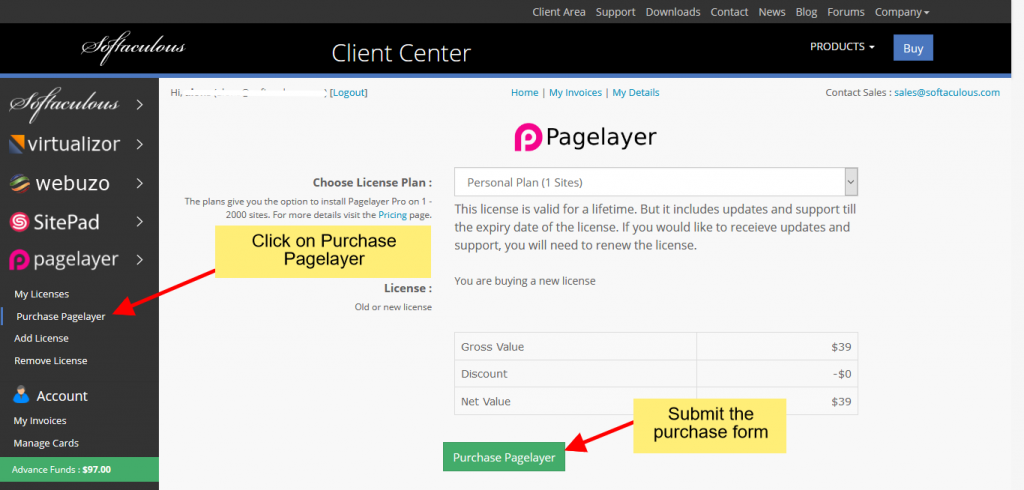 Once you have logged in, from the left menu click on Pagelayer -> Purchase Pagelayer
