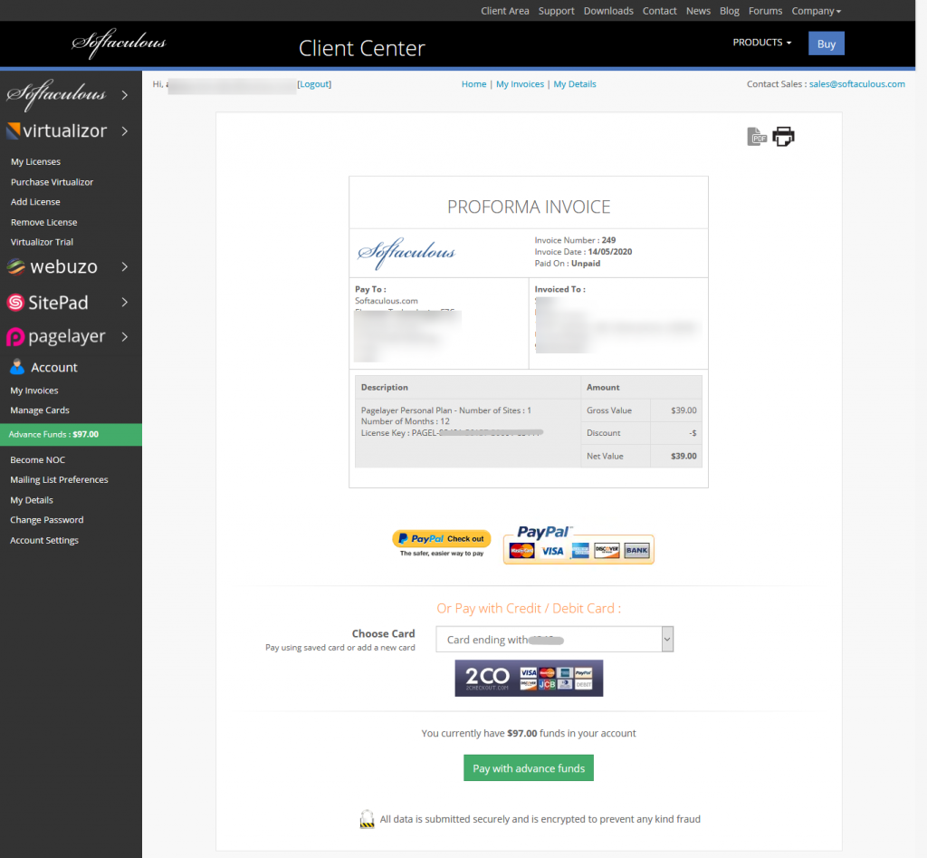 Once you submit the purchase form a Proforma Invoice will be created and you will be redirected to the invoice page.