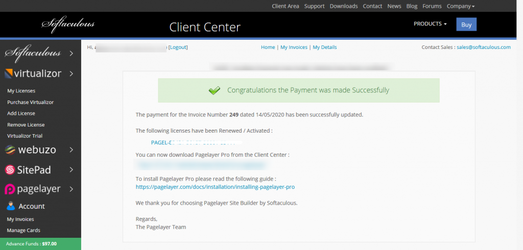 Once the payment is completed you will be redirected back to Pagelayer Client Center and your license will be activated.