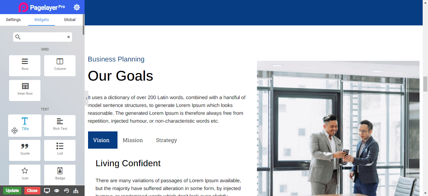 Customize your titles and headers efficiently with Title Widget. Choose how big you’d like to display your title, the text color, and it’s alignment. Customize from several options and set its color, as well.